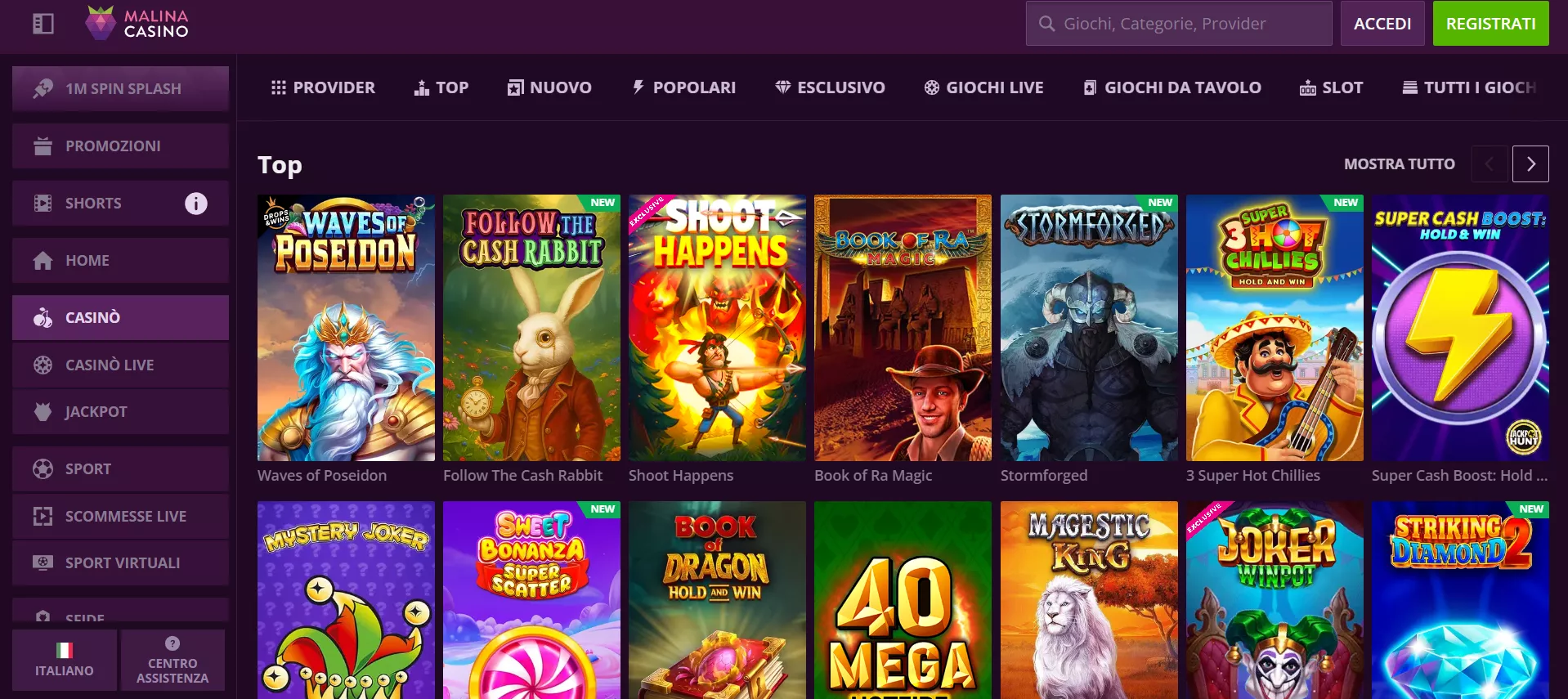 Casino Malina si distingue nel panorama dei casinò online italiani per la sua vasta offerta di giochi, i bonus generosi e la piattaforma tecnologicamente avanzata. Con oltre 6.700 titoli disponibili e partnership con i migliori provider del settore, offre un’esperienza di gioco completa sia per i principianti che per i giocatori esperti.