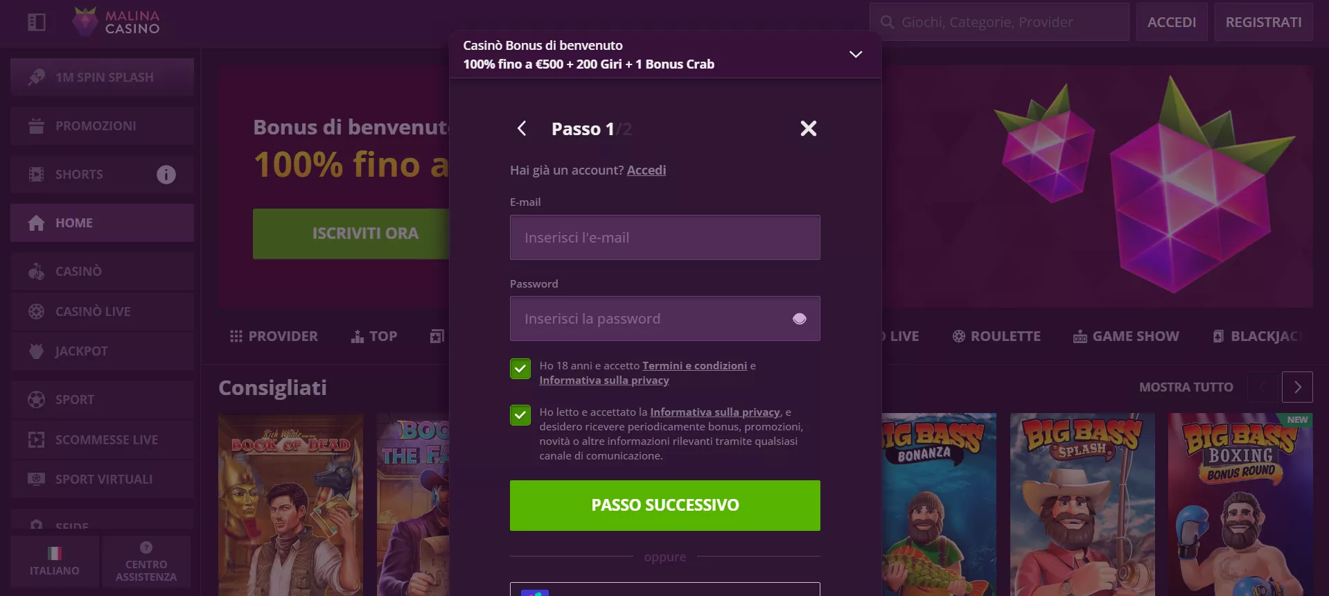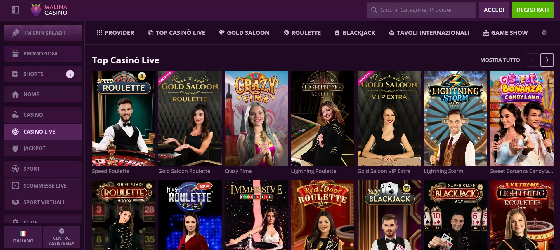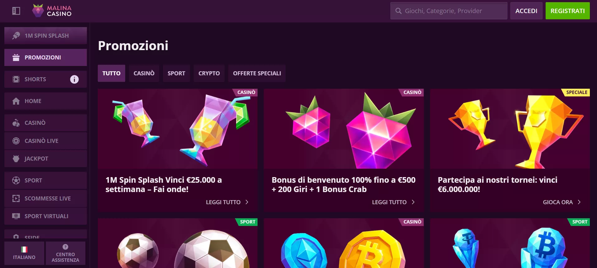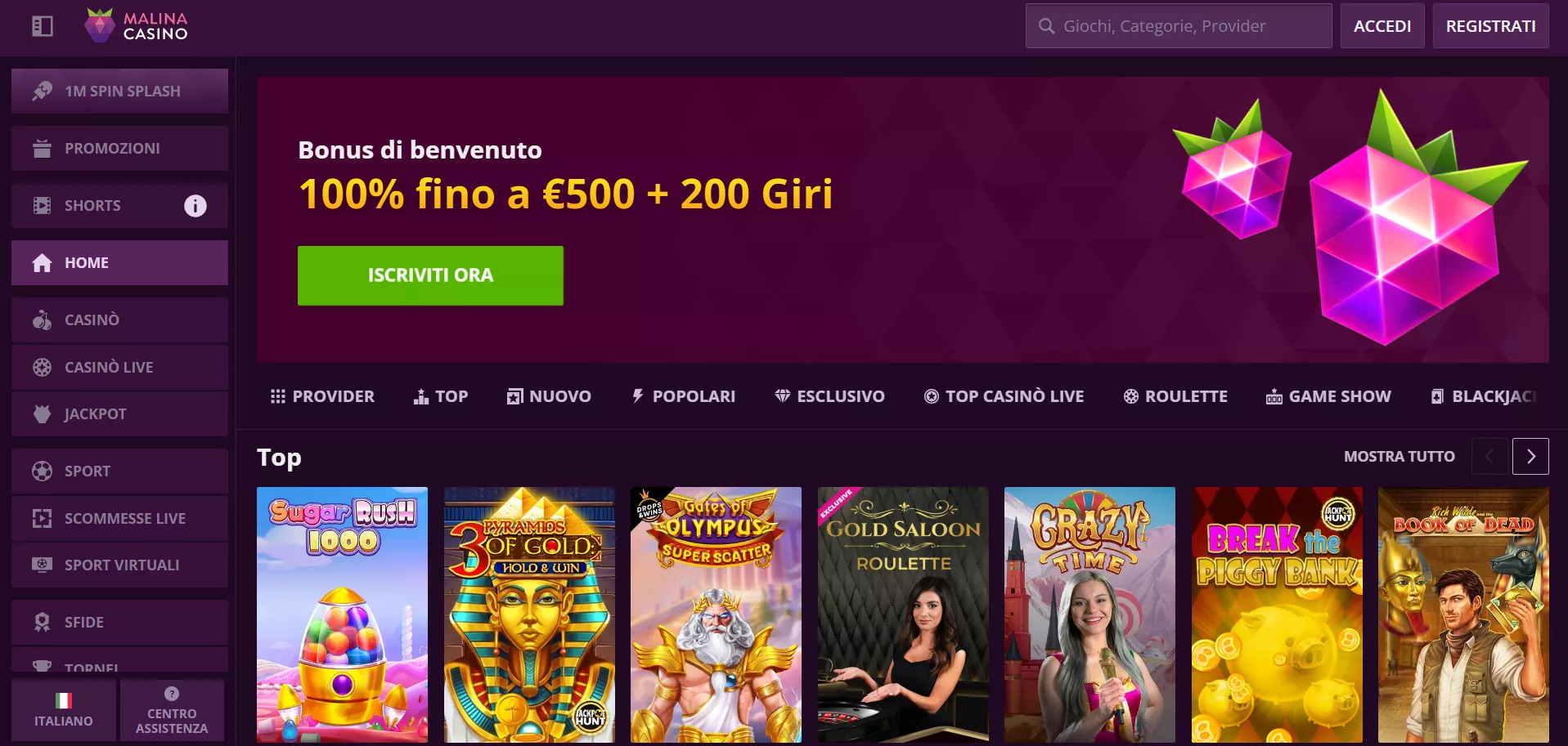 Malina Casino è una piattaforma di gioco online fondata nel 2024 che ha rapidamente conquistato l’attenzione dei giocatori italiani grazie alla sua vasta selezione di giochi e alle generose promozioni. Con oltre 6.700 titoli disponibili da più di 80 provider rinomati, questo casinò online offre un’esperienza di gioco completa che spazia dalle slot ai giochi da tavolo, fino al casinò live con dealer professionali.